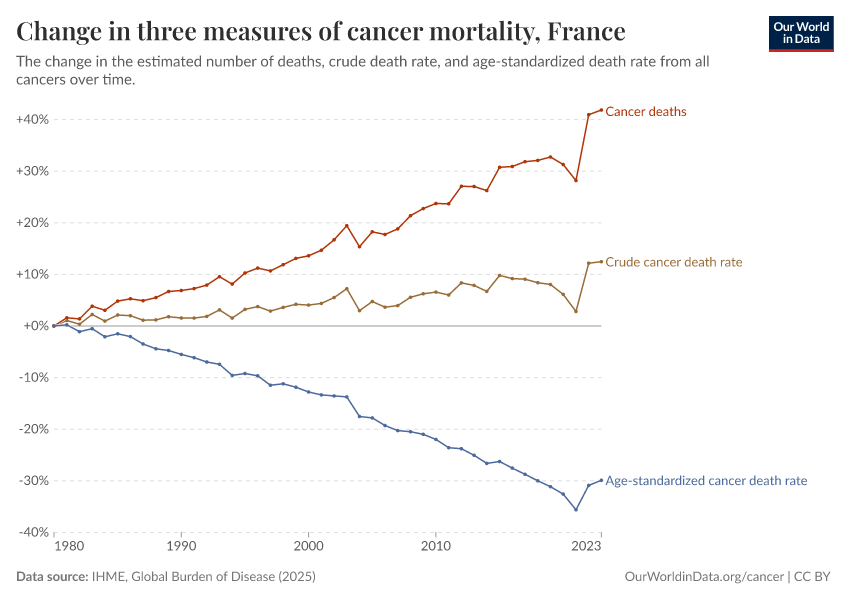 Again, we can use the same indicators to understand mortality: the total number of deaths, the crude death rate (which simply divides the number of deaths by the country’s population), or the age-standardized death rate, which holds the age structure of the population constant, so it tells us about how rates are changing regardless of aging. This is important because the risk of most cancers also increases steeply with age.