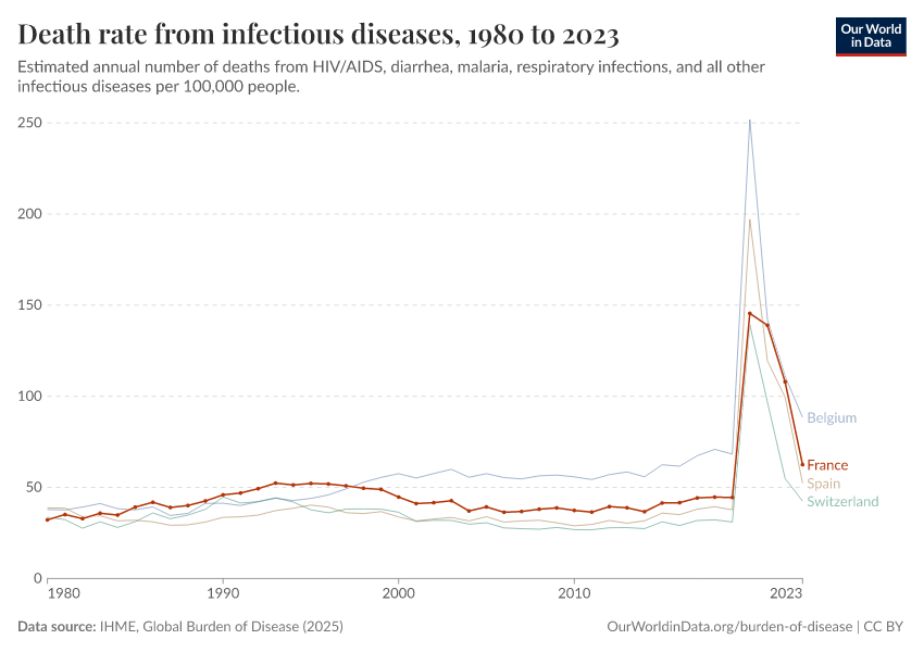 In the chart, you can see how death rates from communicable diseases in France have changed over time. This is shown alongside neighboring countries for comparison.