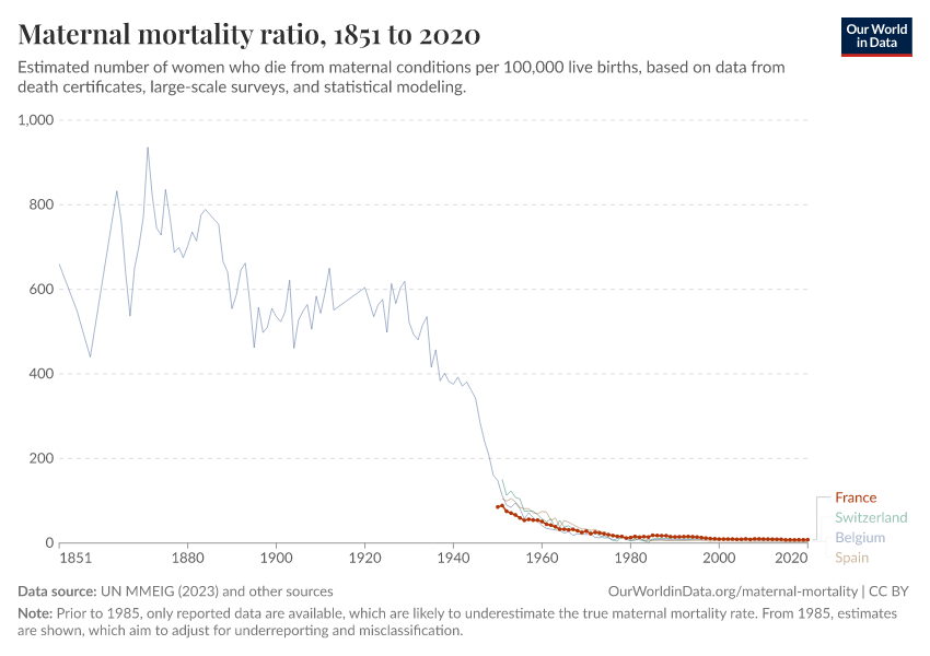 In the chart, you can see France’s maternal mortality rates over time, alongside neighboring countries for comparison. This is measured as the number of deaths per 100,000 live births.