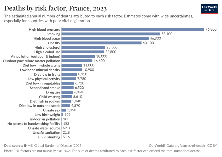 In the chart, you can see modeled estimates for how many people in France die prematurely as a result of various risk factors. Note that the same death can be attributed to multiple risk factors, so the death tolls from different risk factors cannot simply be added up (this is why their sum can be higher than the total number of deaths).