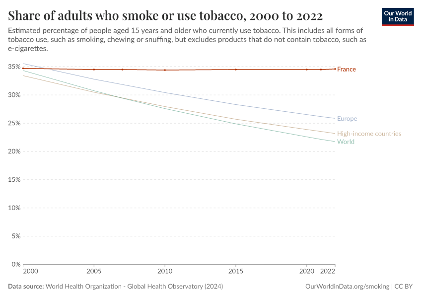 In the chart, you can see the share of adults in France who use tobacco. This is shown alongside the average globally and regionally.