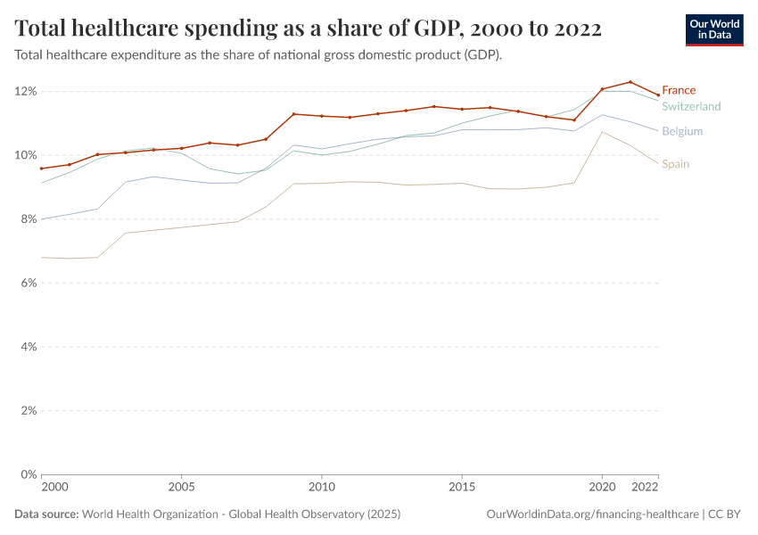 In 2022, France’s healthcare spending was equivalent to 12% of its national gross domestic product (GDP).
