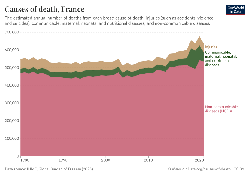 In the chart, you can see the breakdown of deaths in France by these broad categories. In 2023, 50,700 died from communicable diseases, 534,000 from NCDs, and 48,600 from injuries.