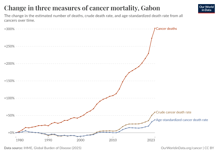 In the chart, you can see how death rates from communicable diseases in Gabon have changed over time. This is shown alongside neighboring countries for comparison.