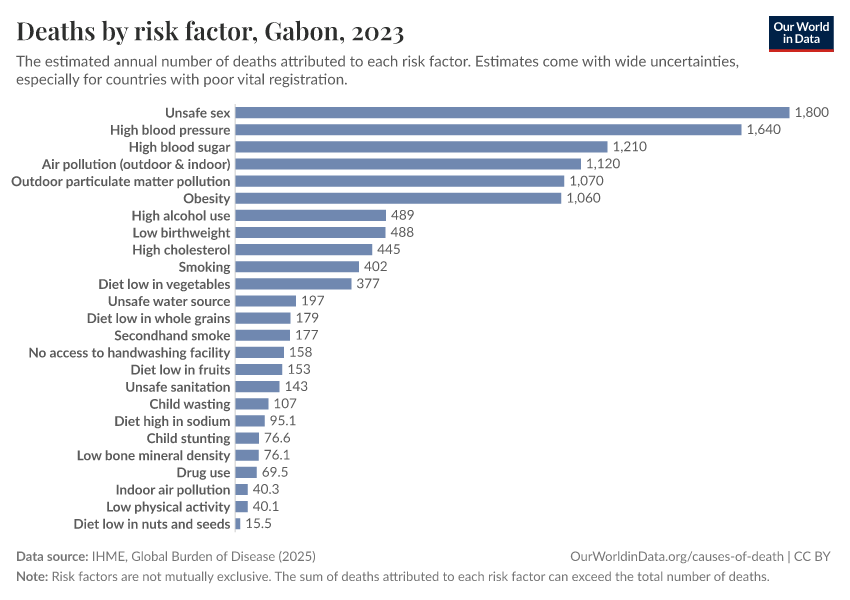 In the chart, you can see modeled estimates for how many people in Gabon die prematurely as a result of various risk factors. Note that the same death can be attributed to multiple risk factors, so the death tolls from different risk factors cannot simply be added up (this is why their sum can be higher than the total number of deaths).