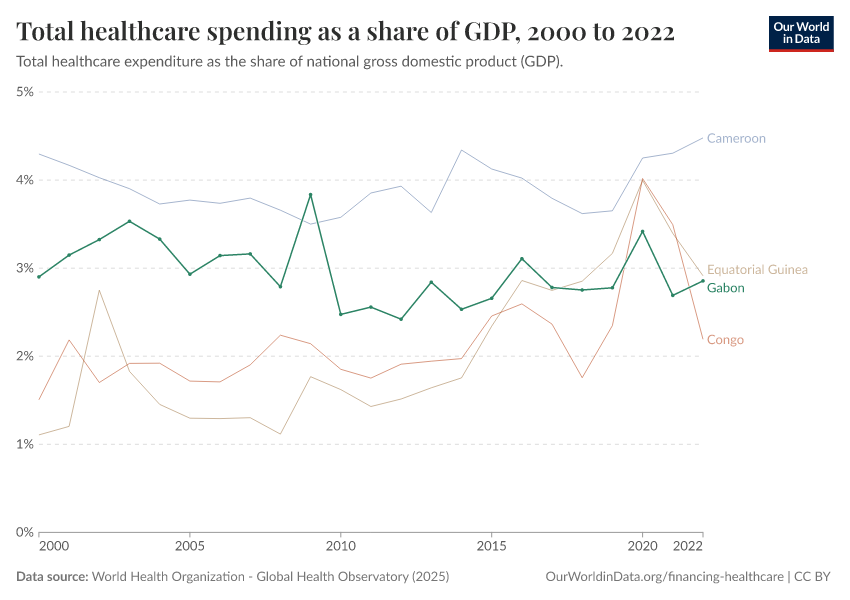 In 2022, Gabon’s healthcare spending was equivalent to 2.9% of its national gross domestic product (GDP).