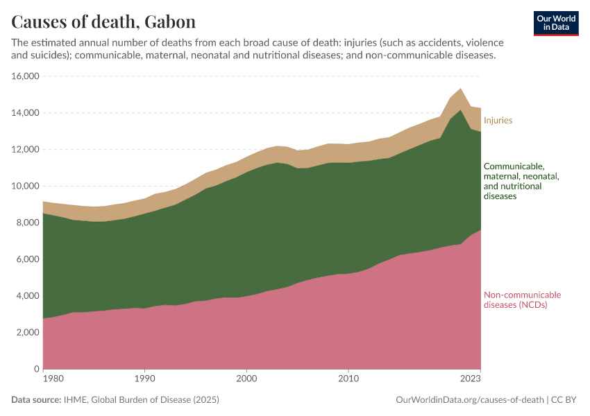 In the chart, you can see the breakdown of deaths in Gabon by these broad categories. In 2023, 5,350 died from communicable diseases, 7,610 from NCDs, and 1,300 from injuries.
