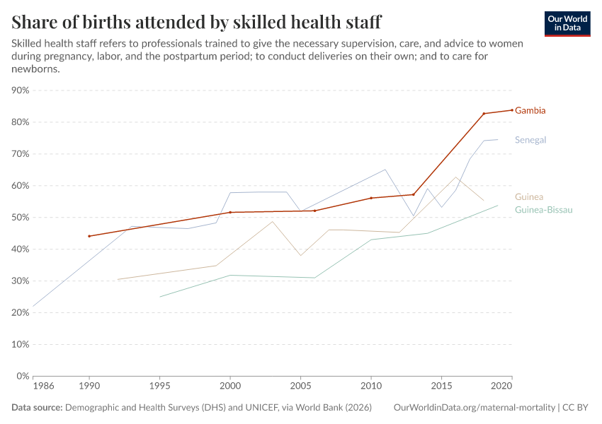 In the chart, you see the share of births attended by skilled workers in the Gambia, alongside its neighbors. In 2020, this share was 84%.