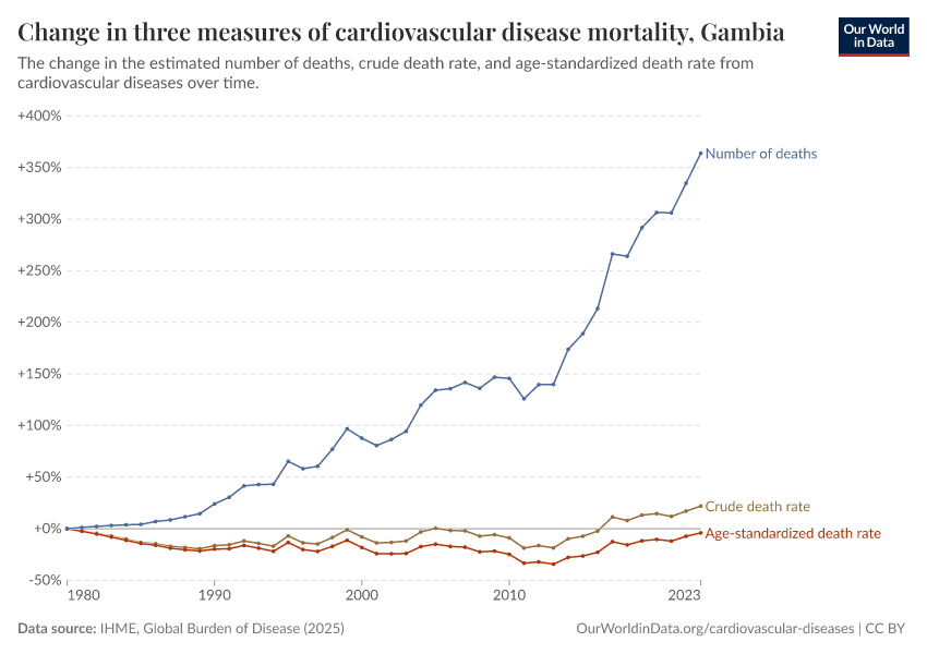 Are deaths from cardiovascular disease in the Gambia increasing or decreasing?