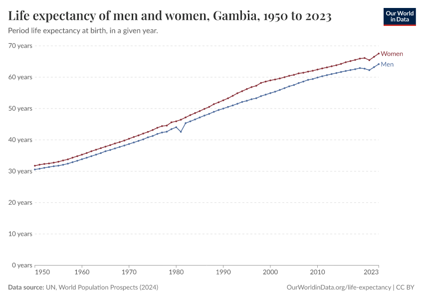 In the chart, you can see life expectancy at birth for men and women in the Gambia.