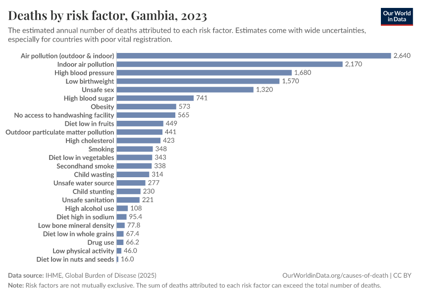 In the chart, you can see modeled estimates for how many people in the Gambia die prematurely as a result of various risk factors. Note that the same death can be attributed to multiple risk factors, so the death tolls from different risk factors cannot simply be added up (this is why their sum can be higher than the total number of deaths).