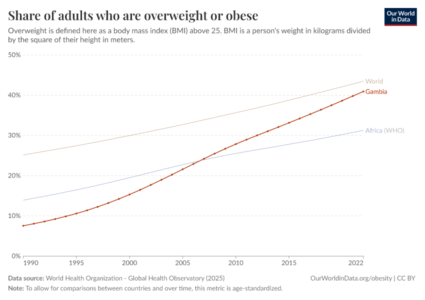 In the chart, you can see the share of adults in the Gambia who are overweight or obese. This is defined as having a body mass index (BMI) equal to or greater than 25. This is shown alongside the global and regional averages.