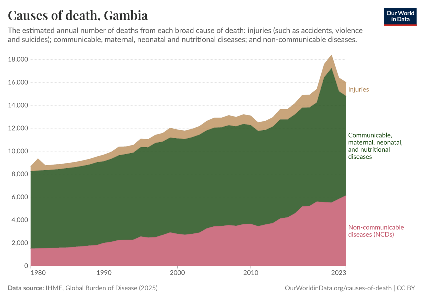 In the chart, you can see the breakdown of deaths in the Gambia by these broad categories. In 2023, 8,650 died from communicable diseases, 6,150 from NCDs, and 1,200 from injuries.