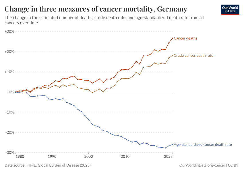 Again, we can use the same indicators to understand mortality: the total number of deaths, the crude death rate (which simply divides the number of deaths by the country’s population), or the age-standardized death rate, which holds the age structure of the population constant, so it tells us about how rates are changing regardless of aging. This is important because the risk of most cancers also increases steeply with age.