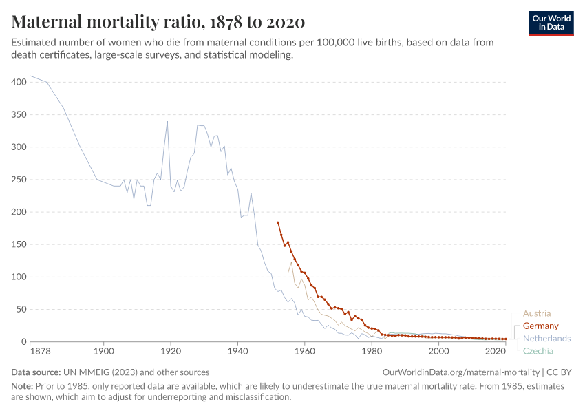 In the chart, you can see Germany’s maternal mortality rates over time, alongside neighboring countries for comparison. This is measured as the number of deaths per 100,000 live births.