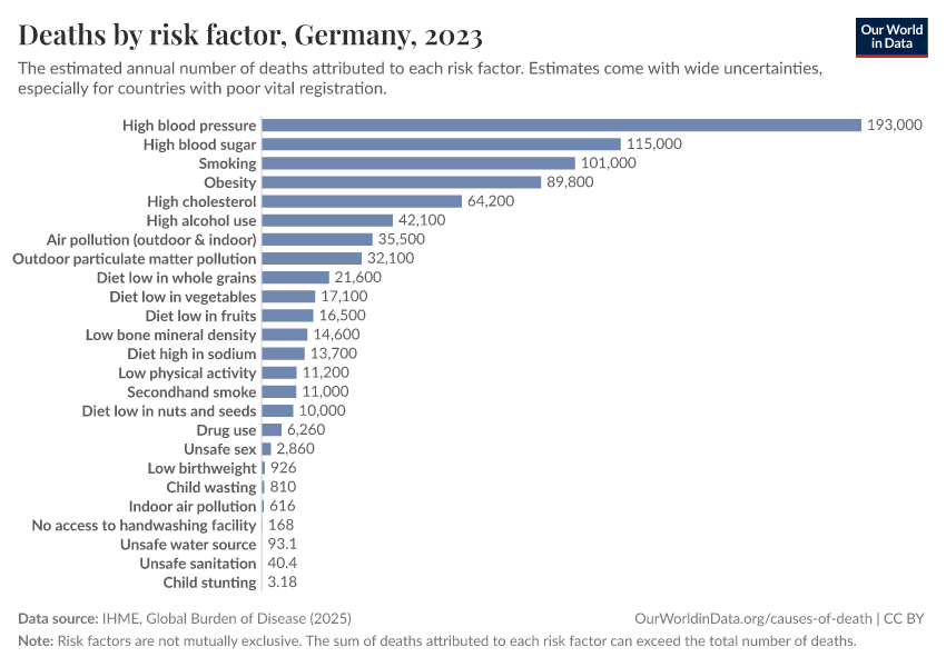 In the chart, you can see modeled estimates for how many people in Germany die prematurely as a result of various risk factors. Note that the same death can be attributed to multiple risk factors, so the death tolls from different risk factors cannot simply be added up (this is why their sum can be higher than the total number of deaths).