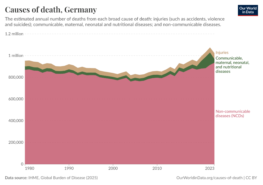 In the chart, you can see the breakdown of deaths in Germany by these broad categories. In 2023, 34,300 died from communicable diseases, 934,000 from NCDs, and 54,400 from injuries.