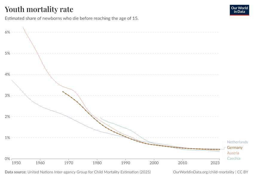 The latest data, referring to 2023, shows that 0.4% died before the age of 15 in Germany.