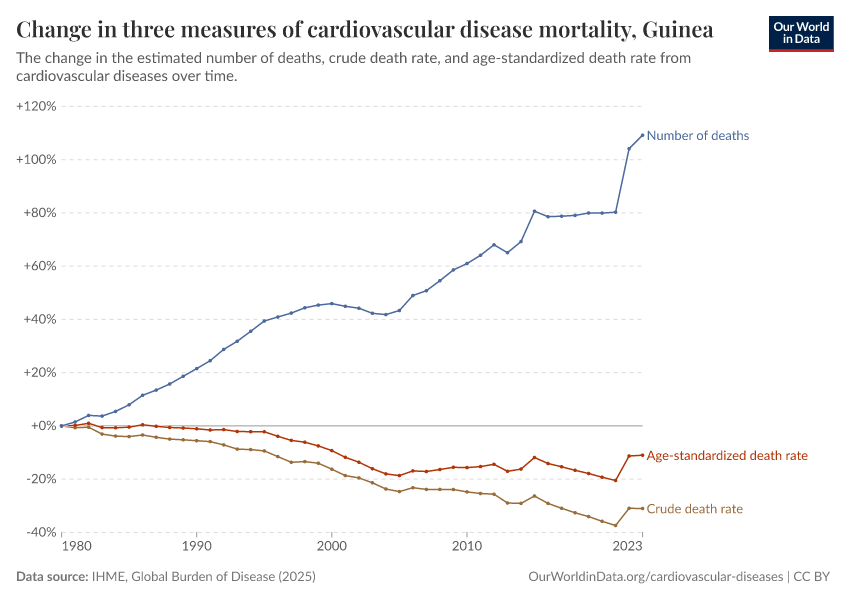 There are several metrics we can use to understand mortality: the total number of deaths, the crude death rate (which simply divides the number of deaths by the country’s population), or the age-standardized death rate, which holds the age structure of the population constant, removing the effect of population aging from the trend.