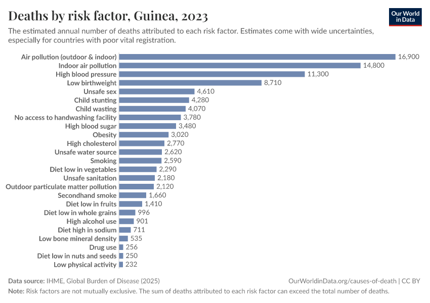 In the chart, you can see modeled estimates for how many people in Guinea die prematurely as a result of various risk factors. Note that the same death can be attributed to multiple risk factors, so the death tolls from different risk factors cannot simply be added up (this is why their sum can be higher than the total number of deaths).