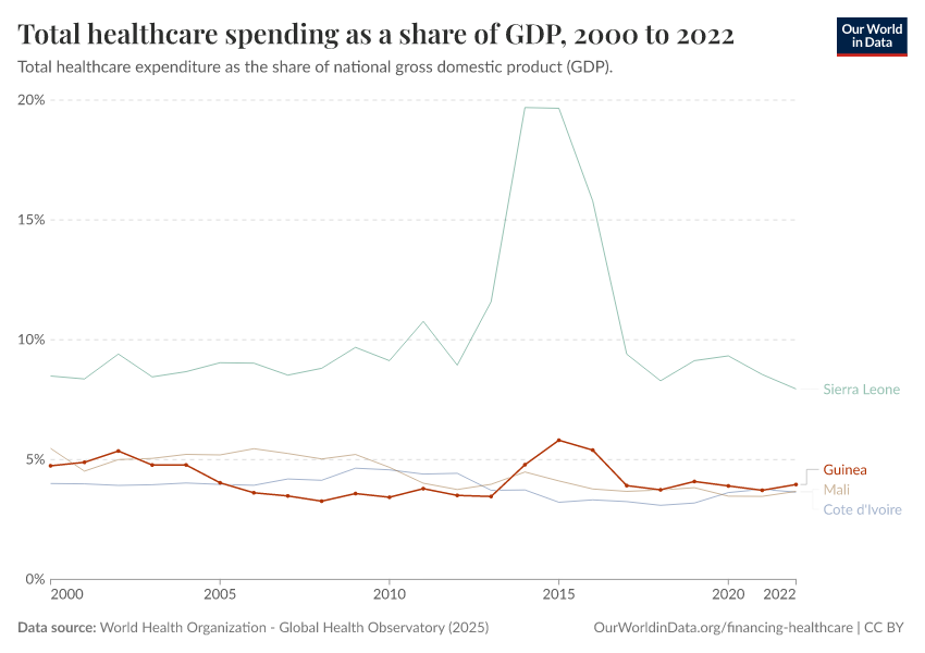 In 2022, Guinea’s healthcare spending was equivalent to 4.0% of its national gross domestic product (GDP).