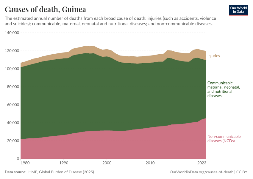 In the chart, you can see the breakdown of deaths in Guinea by these broad categories. In 2023, 64,400 died from communicable diseases, 45,200 from NCDs, and 10,200 from injuries.