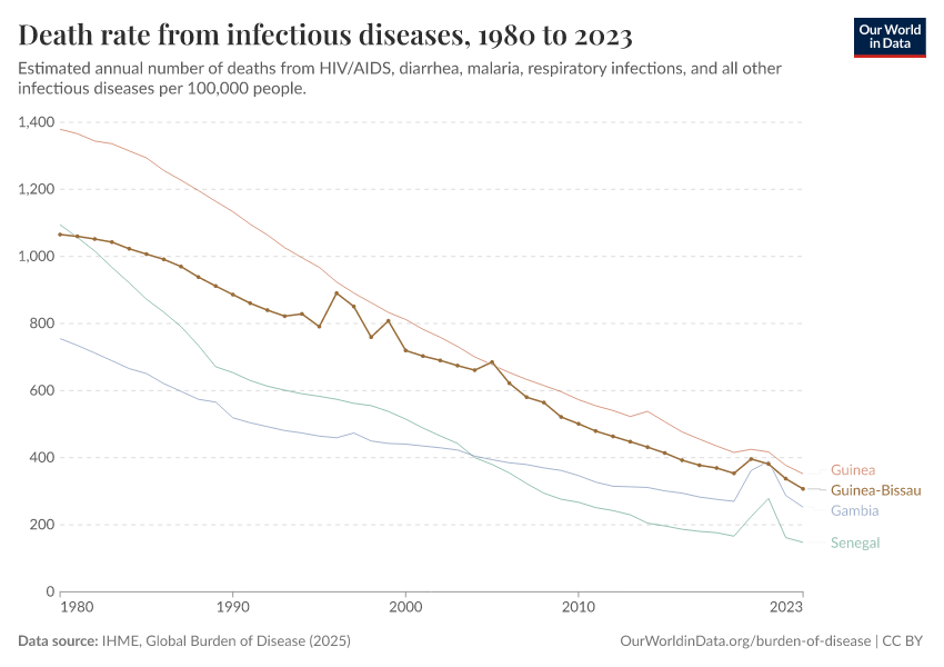 In the chart, you can see how death rates from communicable diseases in Guinea-Bissau have changed over time. This is shown alongside neighboring countries for comparison.