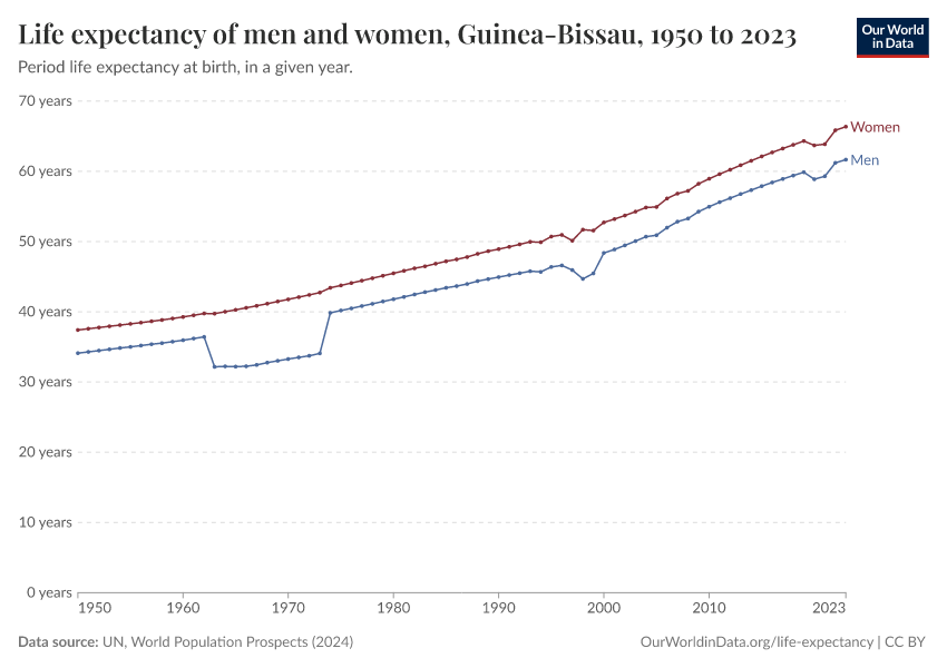 In the chart, you can see life expectancy at birth for men and women in Guinea-Bissau.