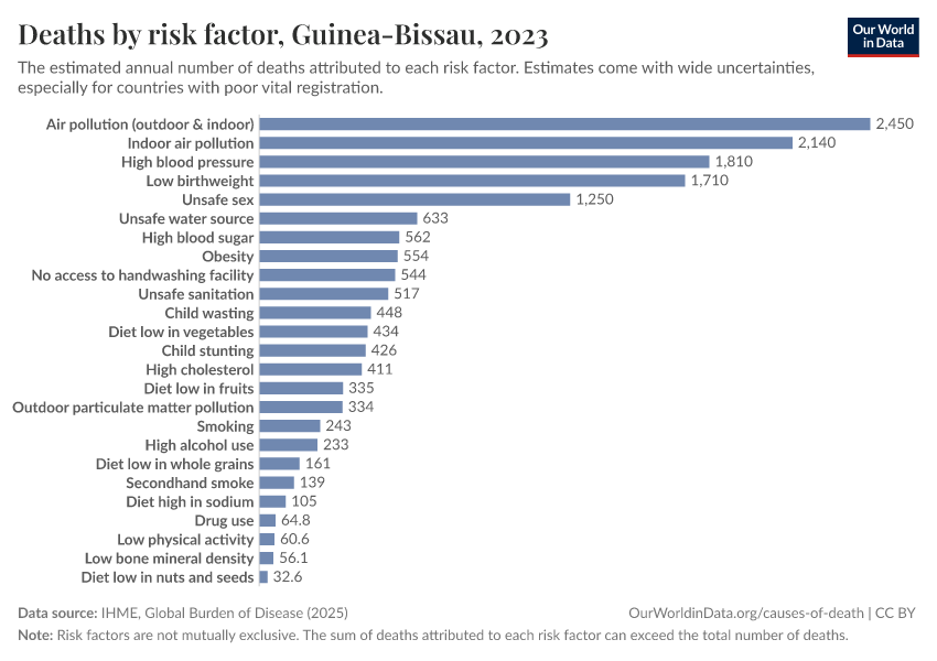 In the chart, you can see modeled estimates for how many people in Guinea-Bissau die prematurely as a result of various risk factors. Note that the same death can be attributed to multiple risk factors, so the death tolls from different risk factors cannot simply be added up (this is why their sum can be higher than the total number of deaths).