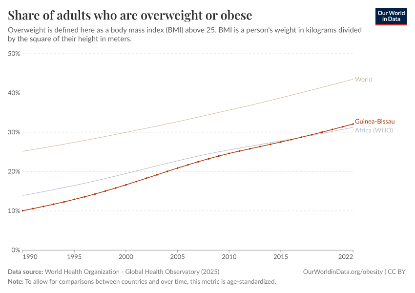 In the chart, you can see the share of adults in Guinea-Bissau who are overweight or obese. This is defined as having a body mass index (BMI) equal to or greater than 25. This is shown alongside the global and regional averages.