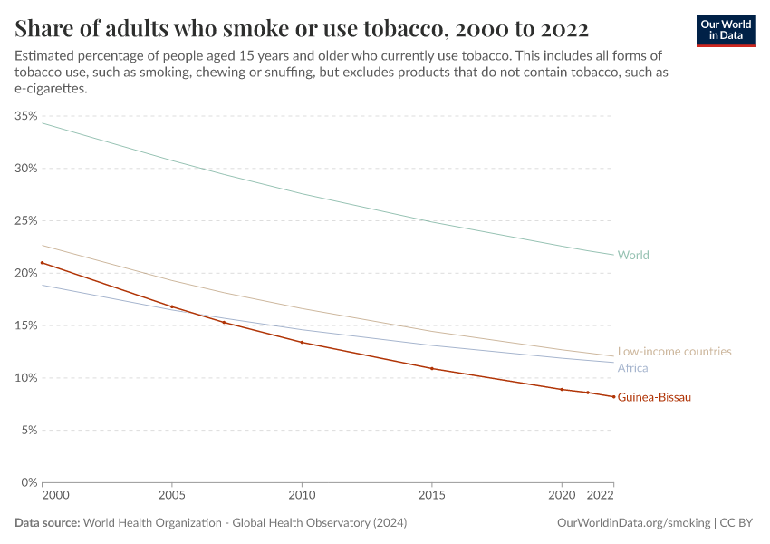 In the chart, you can see the share of adults in Guinea-Bissau who use tobacco. This is shown alongside the average globally and regionally.