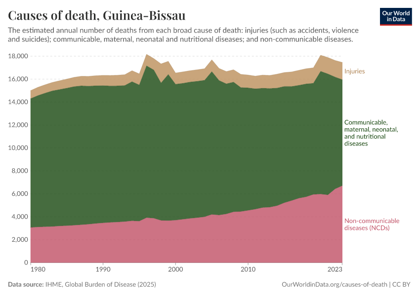 In the chart, you can see the breakdown of deaths in Guinea-Bissau by these broad categories. In 2023, 9,250 died from communicable diseases, 6,710 from NCDs, and 1,510 from injuries.