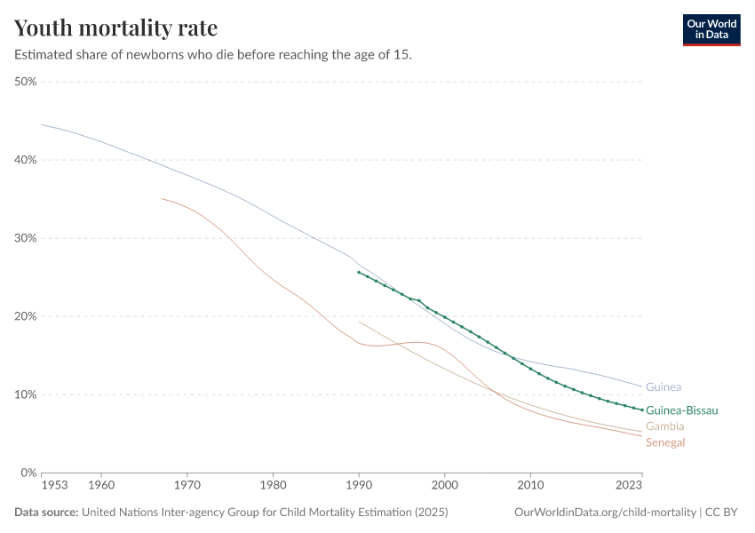The latest data, referring to 2023, shows that 8% died before the age of 15 in Guinea-Bissau.