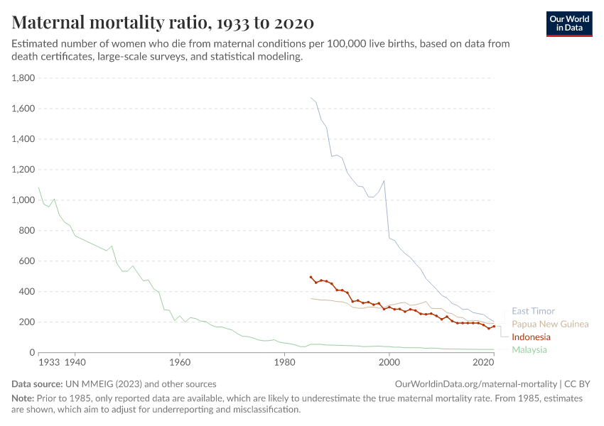 In the chart, you can see Indonesia’s maternal mortality rates over time, alongside neighboring countries for comparison. This is measured as the number of deaths per 100,000 live births.