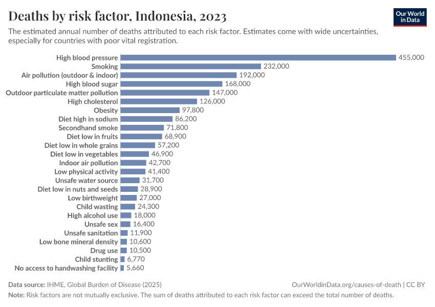 In the chart, you can see modeled estimates for how many people in Indonesia die prematurely as a result of various risk factors. Note that the same death can be attributed to multiple risk factors, so the death tolls from different risk factors cannot simply be added up (this is why their sum can be higher than the total number of deaths).