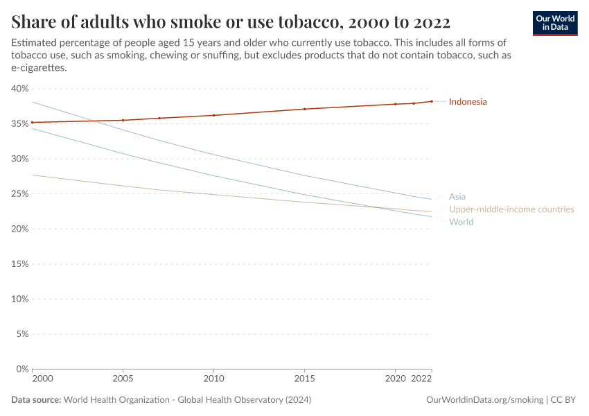 In the chart, you can see the share of adults in Indonesia who use tobacco. This is shown alongside the average globally and regionally.