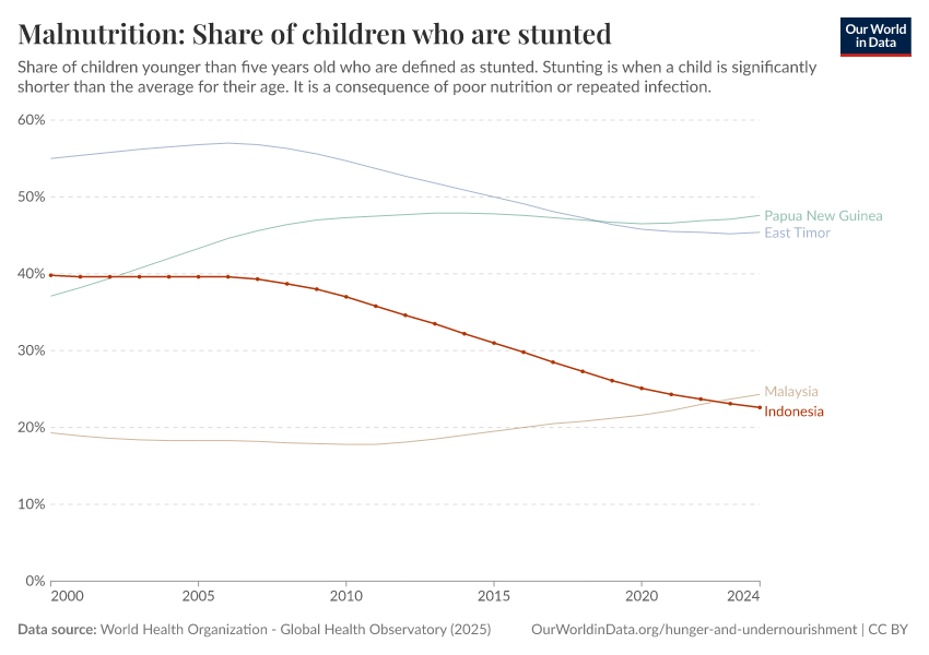 In the chart, you can see what share of children in Indonesia are stunted, alongside neighboring countries. In 2024, this share was 22.6%.