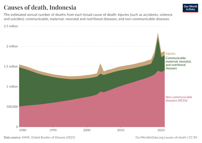 In the chart, you can see the breakdown of deaths in Indonesia by these broad categories. In 2023, 368,000 died from communicable diseases, 1.40 million from NCDs, and 106,000 from injuries.