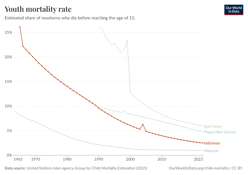 The latest data, referring to 2023, shows that 2.5% died before the age of 15 in Indonesia.