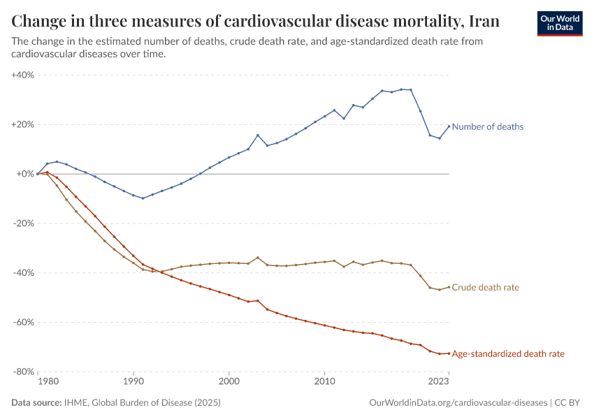 There are several metrics we can use to understand mortality: the total number of deaths, the crude death rate (which simply divides the number of deaths by the country’s population), or the age-standardized death rate, which holds the age structure of the population constant, removing the effect of population aging from the trend.
