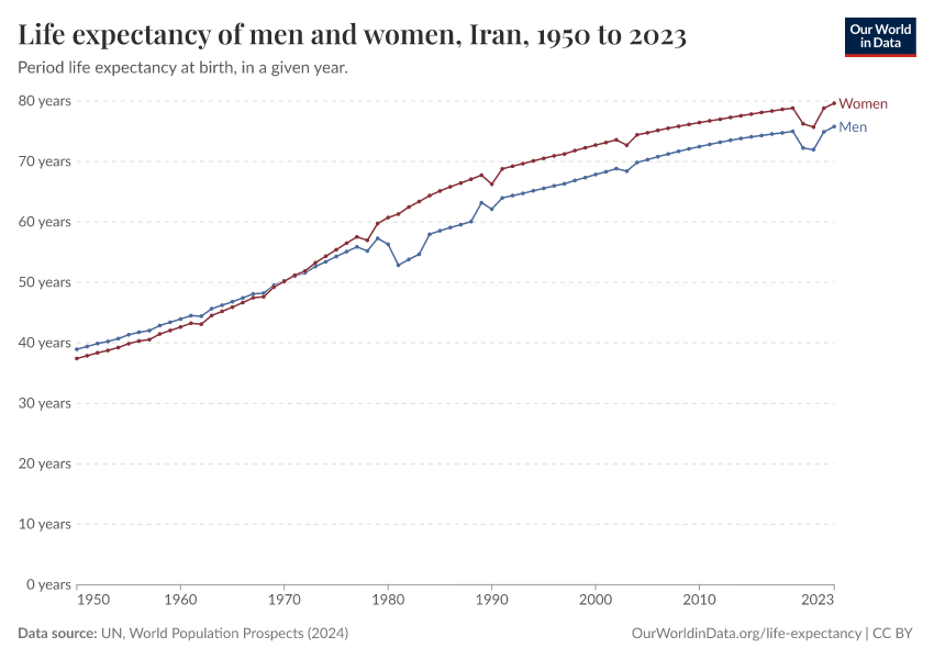 In the chart, you can see life expectancy at birth for men and women in Iran.