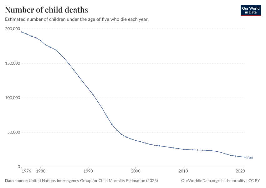 In the chart, you can see the number of children under five in Iran who die in a particular year. In 2023, it was 14,000 children.