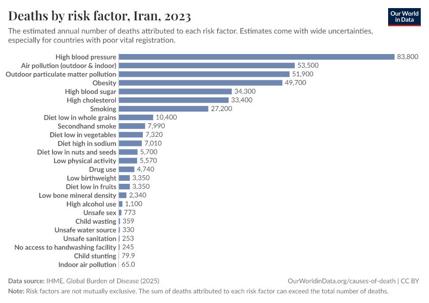 In the chart, you can see modeled estimates for how many people in Iran die prematurely as a result of various risk factors. Note that the same death can be attributed to multiple risk factors, so the death tolls from different risk factors cannot simply be added up (this is why their sum can be higher than the total number of deaths).