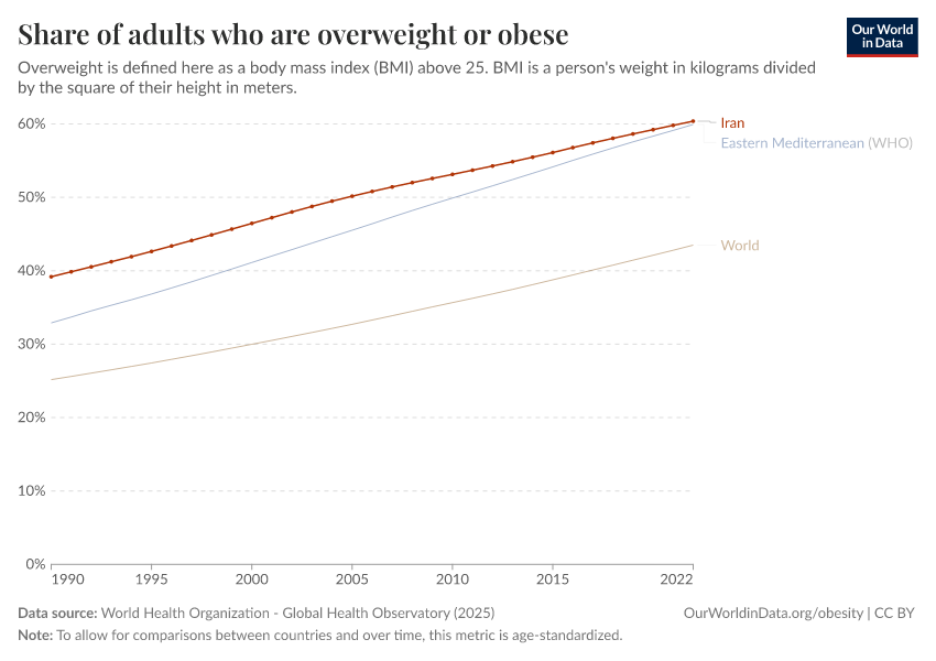 In the chart, you can see the share of adults in Iran who are overweight or obese. This is defined as having a body mass index (BMI) equal to or greater than 25. This is shown alongside the global and regional averages.
