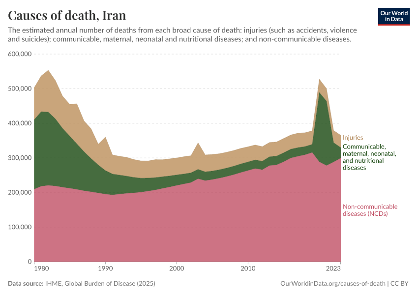 In the chart, you can see the breakdown of deaths in Iran by these broad categories. In 2023, 30,600 died from communicable diseases, 299,000 from NCDs, and 35,300 from injuries.