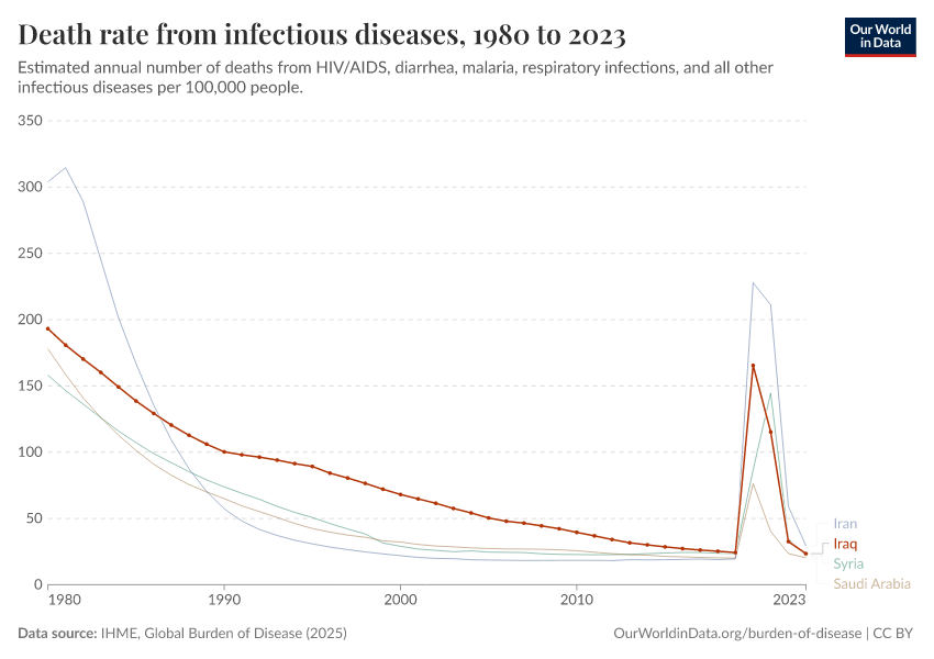 In the chart, you can see how death rates from communicable diseases in Iraq have changed over time. This is shown alongside neighboring countries for comparison.