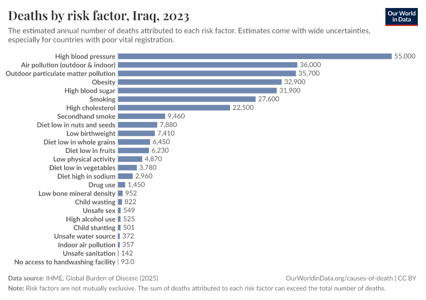 In the chart, you can see modeled estimates for how many people in Iraq die prematurely as a result of various risk factors. Note that the same death can be attributed to multiple risk factors, so the death tolls from different risk factors cannot simply be added up (this is why their sum can be higher than the total number of deaths).