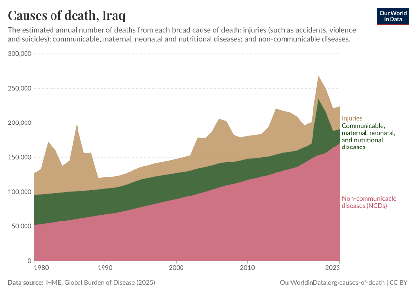 In the chart, you can see the breakdown of deaths in Iraq by these broad categories. In 2023, 20,000 died from communicable diseases, 171,000 from NCDs, and 33,100 from injuries.