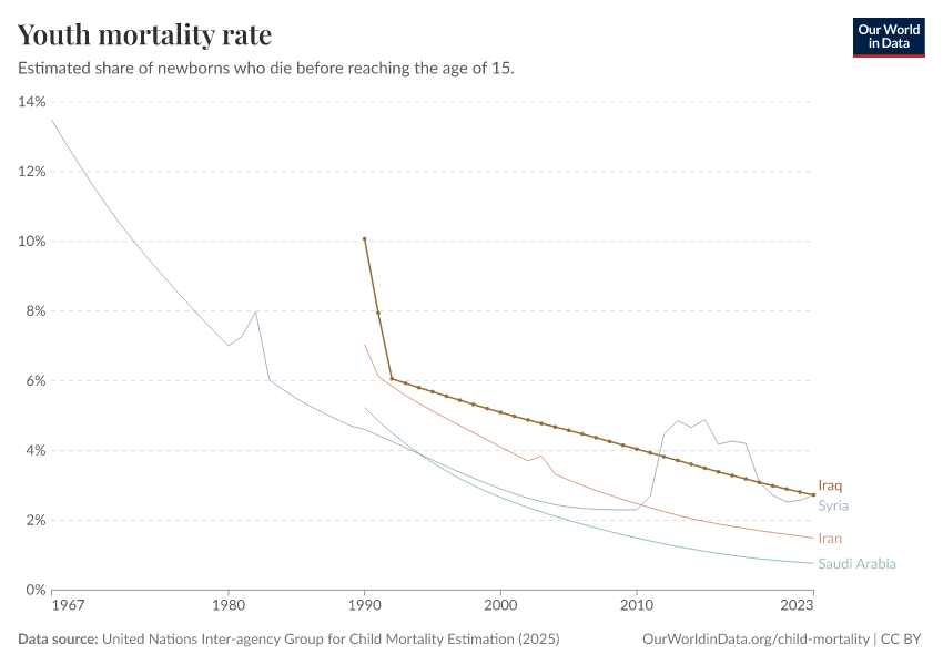 The latest data, referring to 2023, shows that 2.7% died before the age of 15 in Iraq.