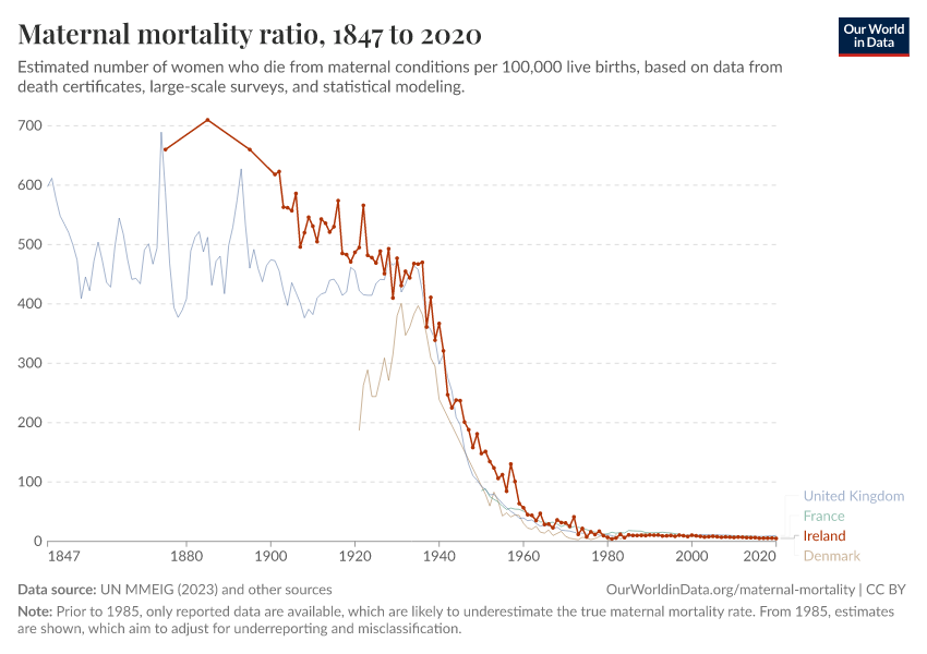 In the chart, you can see Ireland’s maternal mortality rates over time, alongside neighboring countries for comparison. This is measured as the number of deaths per 100,000 live births.
